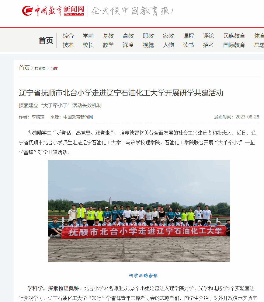 编者按: 近日,中国教育新闻网、东北新闻网、人民日报客户端·人民号对抚顺市北台小学师生走进我校,与理学院、石油化工学院联合开展以“大手牵小手一起学雷锋”为主题的研学共建活动进行了宣传报道。现将相关报道转载如下: