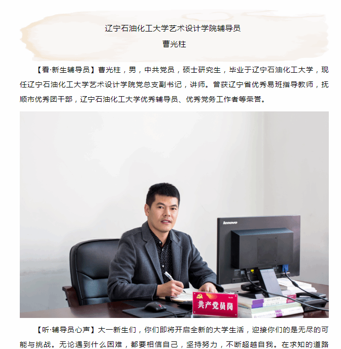 编者按:面对即将开启大学生活的同学们,2023级高校新生辅导员纷纷寄语学生,以青春引路人的身份守护他们的青春、陪伴他们的成长,为青春插上乘风破浪追梦的翅膀。9月24日,辽宁高校思政微信公众号发布了《新生辅导员·心声|致即将向光而行的你(第十九期)》,其中收录了我校艺术设计学院辅导员曹光柱的新生寄语,现将相关报道转载如下: