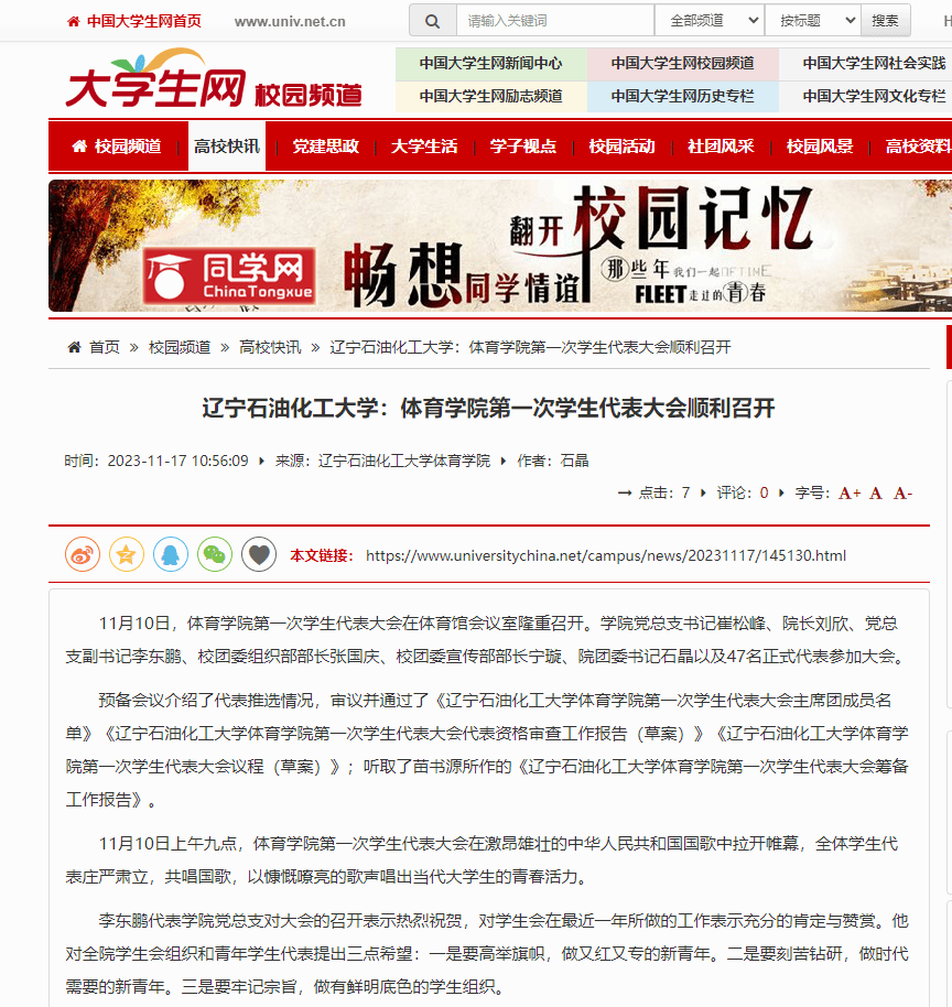 编者按:近日,中国大学生网对我校体育学院第一次学生代表大会的顺利召开进行了宣传报道。现将相关报道转载如下: