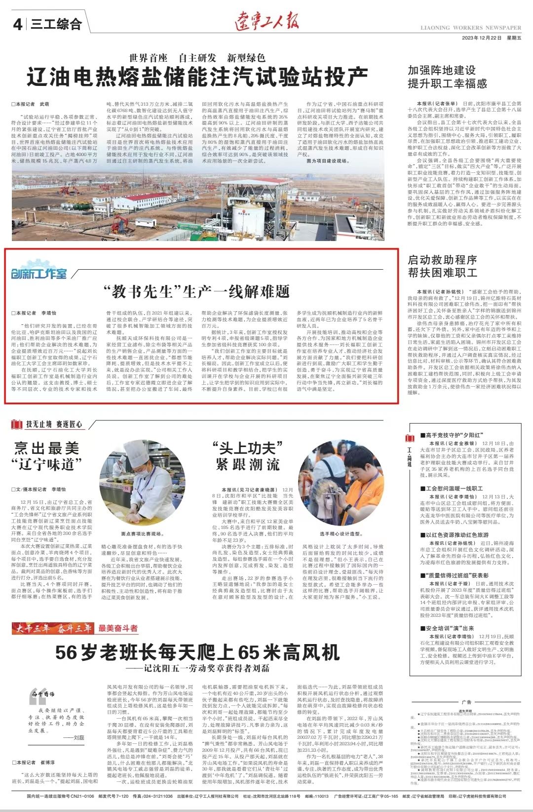 编者按:12月22日,辽宁工人报以《“教书先生”生产一线解难题》为题,对我校刘常福职工创新工作室这支队伍培养人才,通过校企联合、产学研结合等途径,帮助企业解决实际问题的事迹进行了宣传报道,现将相关报道转载如下: