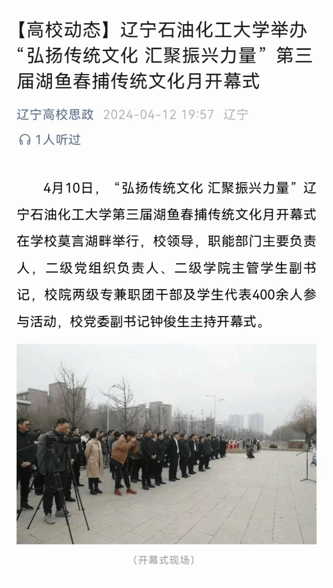 编者按:近日,辽宁高校思政微信公众号、北斗融媒对我校举办“弘扬传统文化 汇聚振兴力量”第三届湖鱼春捕传统文化月开幕式进行报道。现将相关报道转载如下: