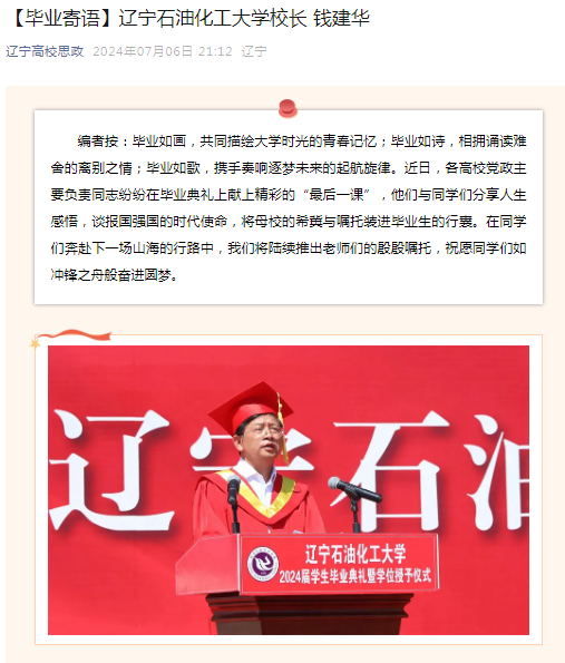 编者按:近日,各高校党政主要负责同志纷纷在毕业典礼上献上精彩的“最后一课”,他们与同学们分享人生感悟,谈报国强国的时代使命,将母校的希冀与嘱托装进毕业生的行囊。7月6日,辽宁高校思政微信公众号对我校校长钱建华在2024届毕业生典礼上的讲话,进行了刊载宣传。现将相关报道转载如下: