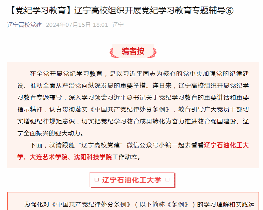 编者按:连日来,辽宁高校组织开展党纪学习教育专题辅导,教育引导广大党员干部切实增强纪律规矩意识,切实把党纪学习教育成果转化为奋力推进教育强国建设、辽宁全面振兴的强大动力。7月15日,辽宁高校党建微信公众号对我校举办党纪学习教育第二期专题辅导培训进行了组稿宣传。现将相关报道转载如下: