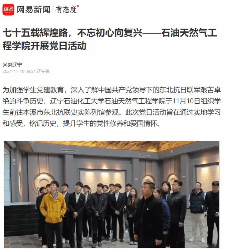 编者按:近日,石油天然气工程学院组织学生前往本溪市东北抗联史实陈列馆参观。网易辽宁、辽宁日报•辽望号对此进行了宣传报道。现将相关报道转载如下: