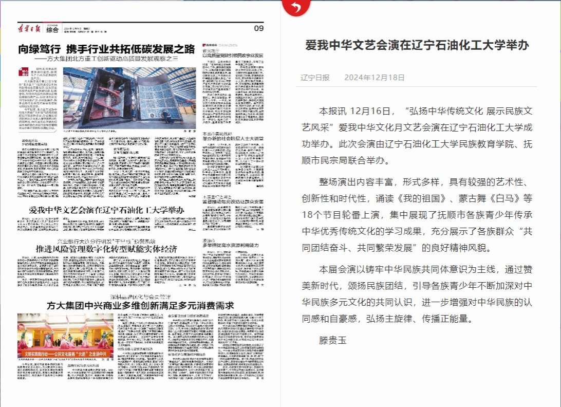 编者按:12月16日,学校成功举办“弘扬中华传统文化 展示民族文艺风采”爱我中华文化月文艺会演。整场演出内容丰富,形式多样,具有较强的艺术性、创新性和时代性,诵读《我的祖国》、蒙古舞《白马》等18个节目轮番上演,集中展现了各族青少年传承中华优秀传统文化的学习成果,充分展示了各族群众“共同团结奋斗、共同繁荣发展”的良好精神风貌。12月18日,辽宁日报第9版对此进行了宣传报道。现将相关报道转载如下: