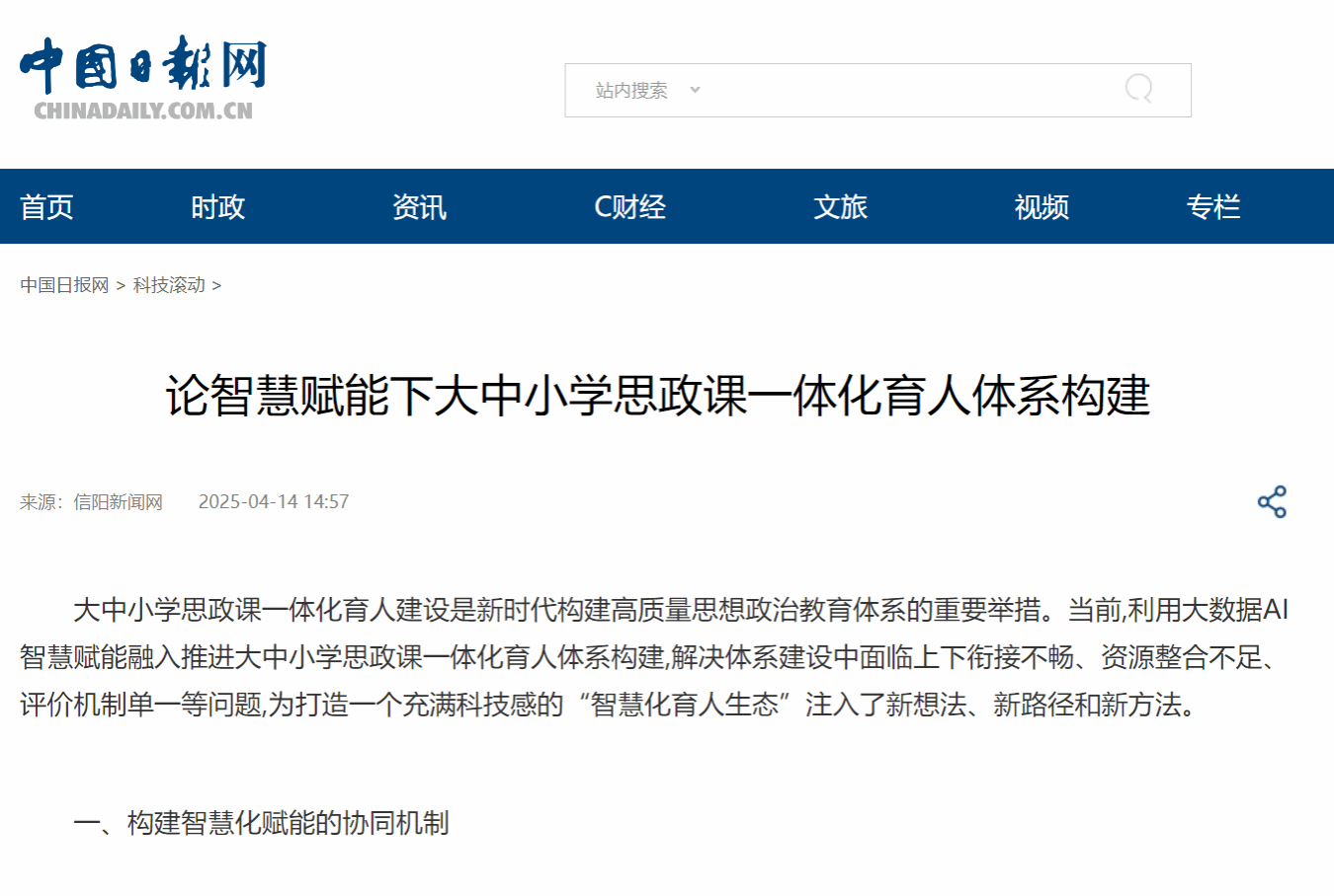 中国日报网:论智慧赋能下大中小学思政课一体化育人体系构建