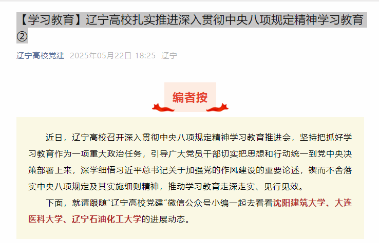 辽宁高校党建微信公众号:【学习教育】辽宁高校扎实推进深入贯彻中央八项规定精神学习教育②