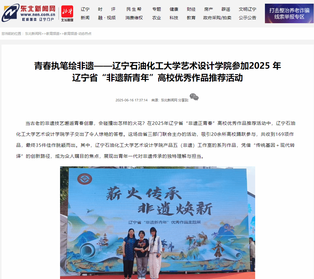 编者按:近日,我校艺术设计学院参加2025 年辽宁省“非遗新青年”高校优秀作品推荐活动,学院产品五(非遗)工作室的系列作品在活动中脱颖而出,成为众人瞩目的焦点,展现出青年一代对非遗传承的独特理解与担当。东北新闻网对此进行了宣传报道。现将相关报道转载如下: