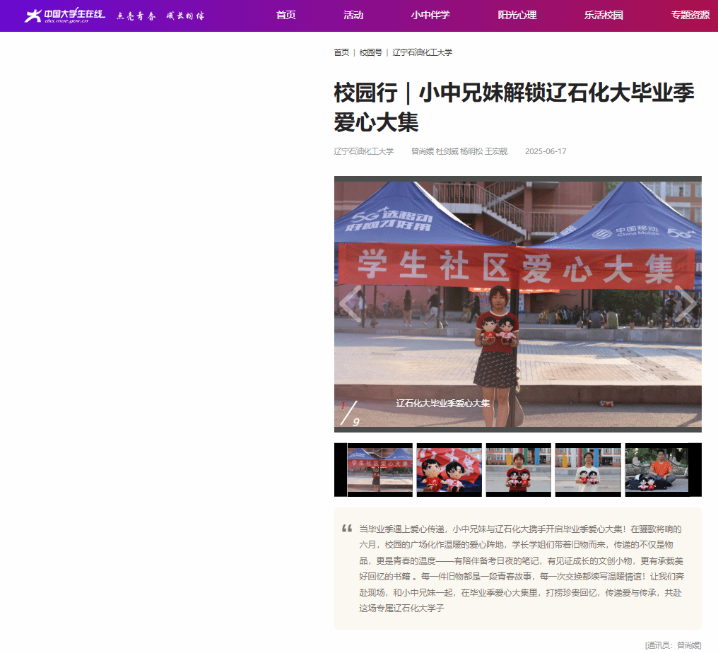 编者按:当毕业季遇上爱心传递,小中兄妹与辽石化大携手开启毕业季爱心大集!6月17日,中国大学生在线网站对我校举行爱心大集活动,以图集形式进行了宣传,现将相关报道转载如下: