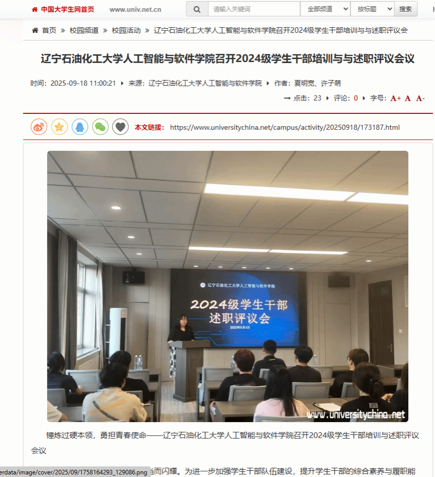编者按:近日,为进一步加强学生干部队伍建设,人工智能与软件学院精心组织开展2024级学生干部培训与述职评议工作,通过“培训赋能+述职复盘”的模式,为新学期学生工作高质量开展注入新动力。中国大学生网对此进行了宣传报道。现将相关报道转载如下: