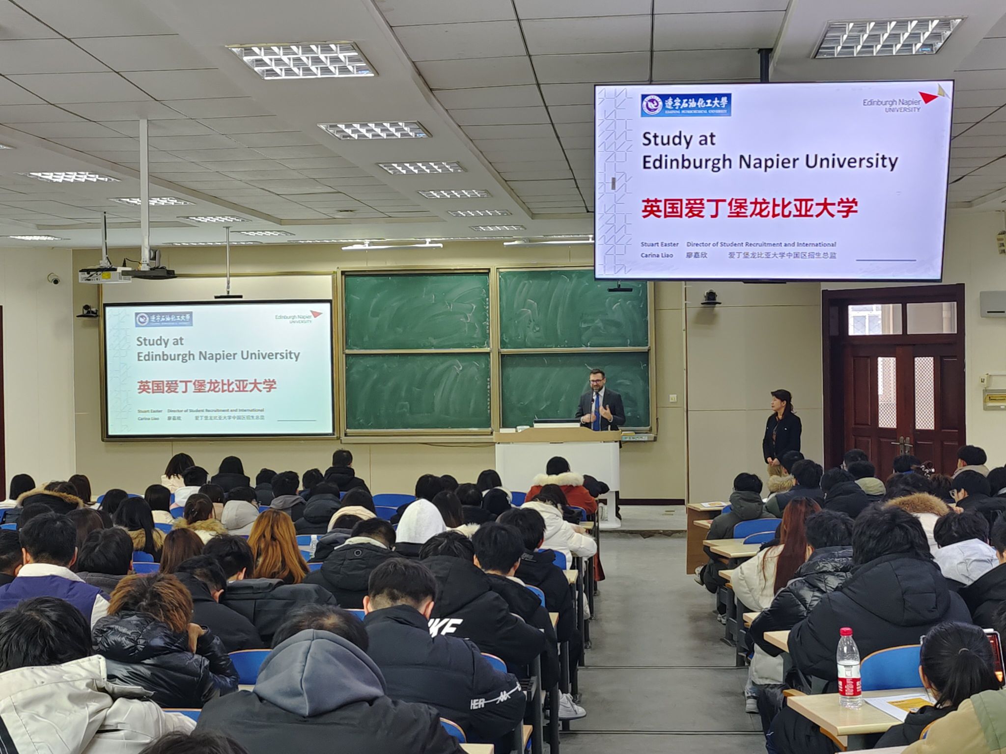 下午,在教四A102教室,Stuart Easter一行就爱丁堡龙比亚大学学校介绍及两校校级交流项目介绍举办了宣传讲座,全校两百余名学生聆听讲座。讲座结束后,学生们踊跃咨询校际交流项目相关问题。此次宣讲使更多学生了解与爱丁堡龙比亚大学进行校际合作的具体内容及申请流程。