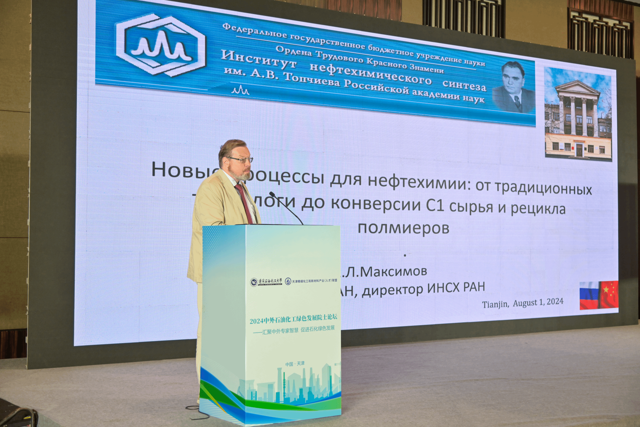 领导致辞之后院士论坛正式开始。六位院士专家围绕石油化学新工艺、炼化企业绿色低碳发展、发展新质生产力等方面分别作了主旨报告。俄罗斯科学院马克西莫夫院士作了题为《石油化学新工艺:从传统技术到二氧化碳转化和聚合物化学回收》的主旨报告,详细介绍了炼油、天然气和石油化工、工业有机合成、生物精炼、制氢、二氧化碳利用等一系列工艺中所使用的新催化剂。