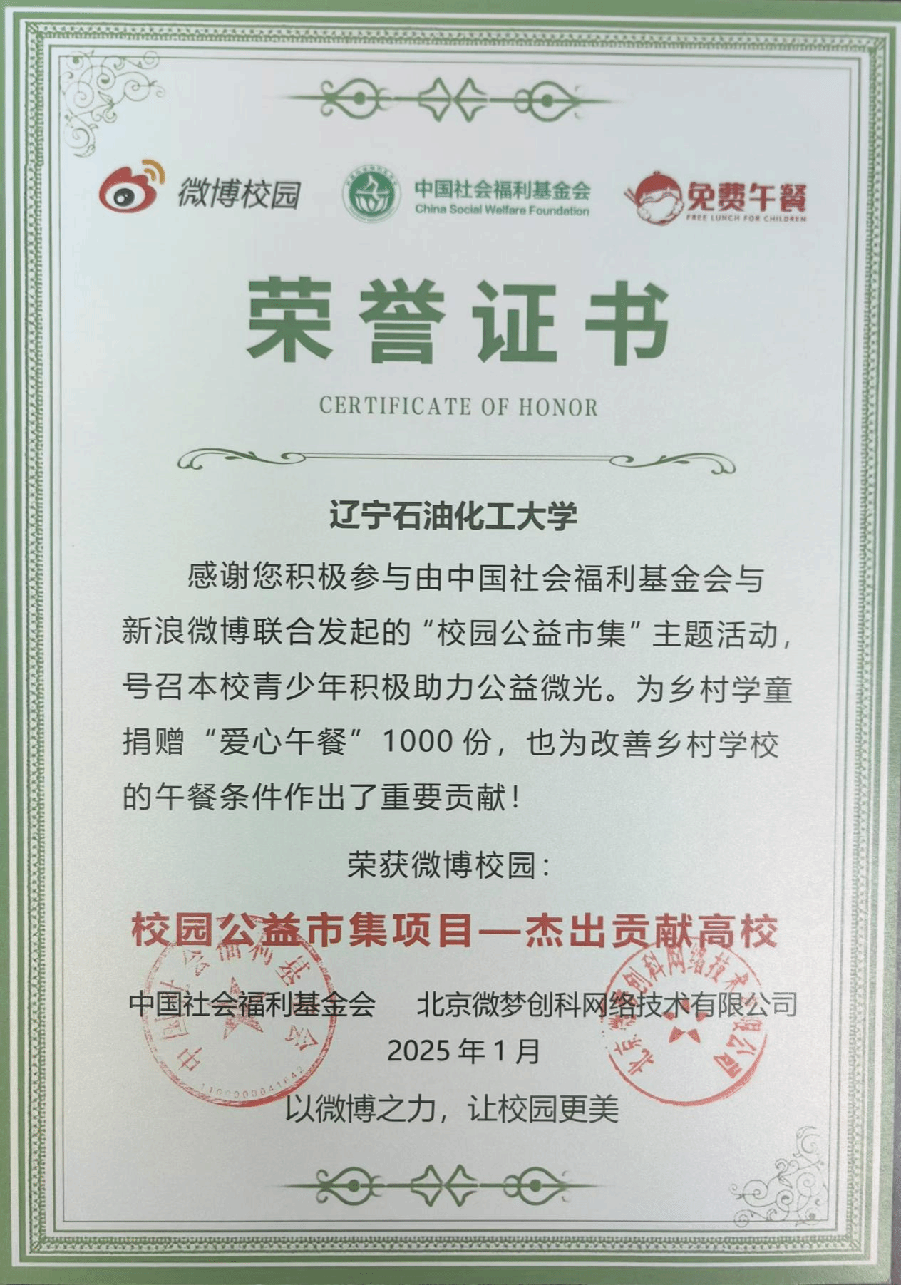 近日,学校在中国社会福利基金会与新浪微博联合发起的“校园公益市集”主题活动中表现突出,荣获“校园公益市集项目—杰出贡献高校”称号。该活动旨在号召青少年积极参与公益行动,通过助力“爱心午餐”项目,改善乡村学校午餐条件,为乡村学童的健康成长贡献力量。